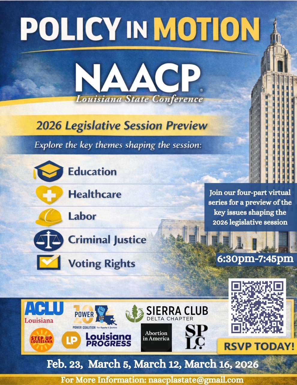 Join the NAACP Louisiana State Conference and our partners for a four-part virtual series “Policy In Motion” as we discuss key issues shaping the 2026 legislative session. Hear from policy experts on topics impacting our communities: education, healthcare, maternal health, labor, criminal justice, and voting rights. Stay informed, engaged, and prepared for the legislative season ahead.